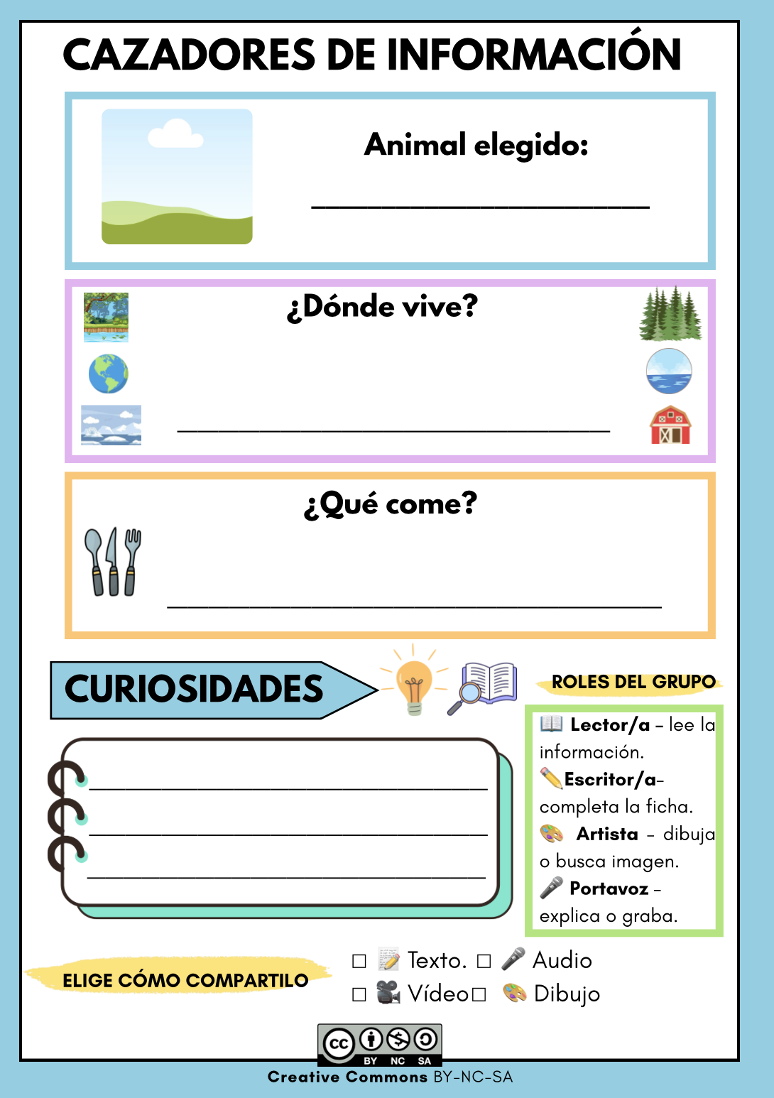 Ficha guía para que el alumnado aprenda a seleccionar información sobre los animales del mundo a través de una pequeña investigación que realizarán en equipos utilizando la plataforma Padlet.