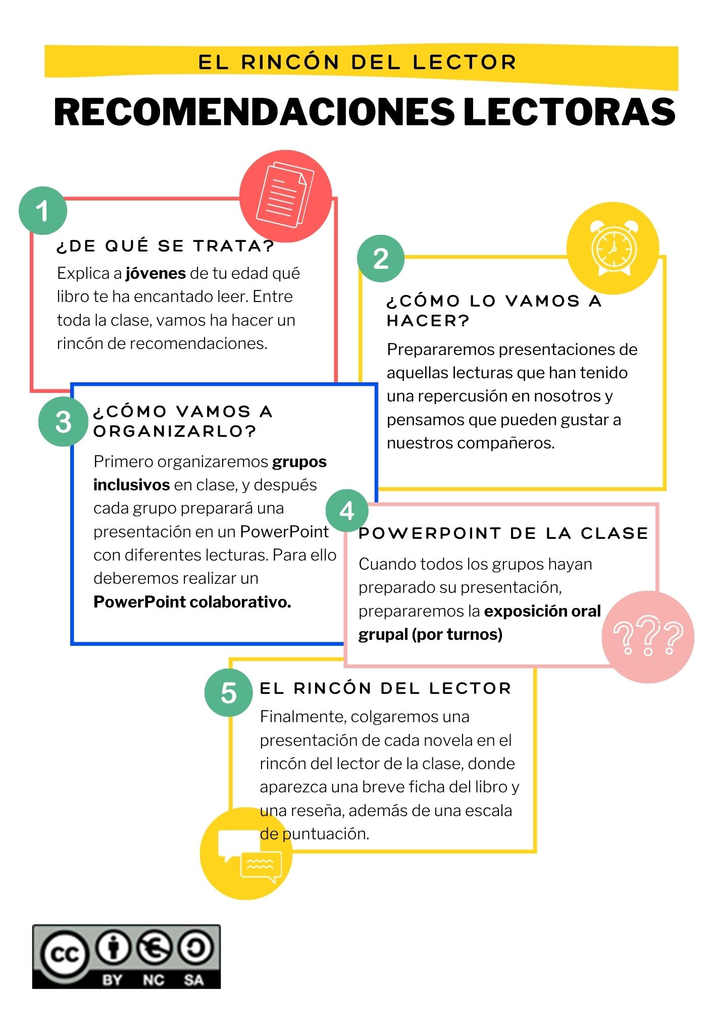 Actividad inicial de fomento de la lectura dirigida a 1º de la ESO que consiste en compartir sus novelas favoritas con sus compañeros, realizando un Power-point y una exposición oral por grupos, para finalmente crear un rincón del lector en el aula.