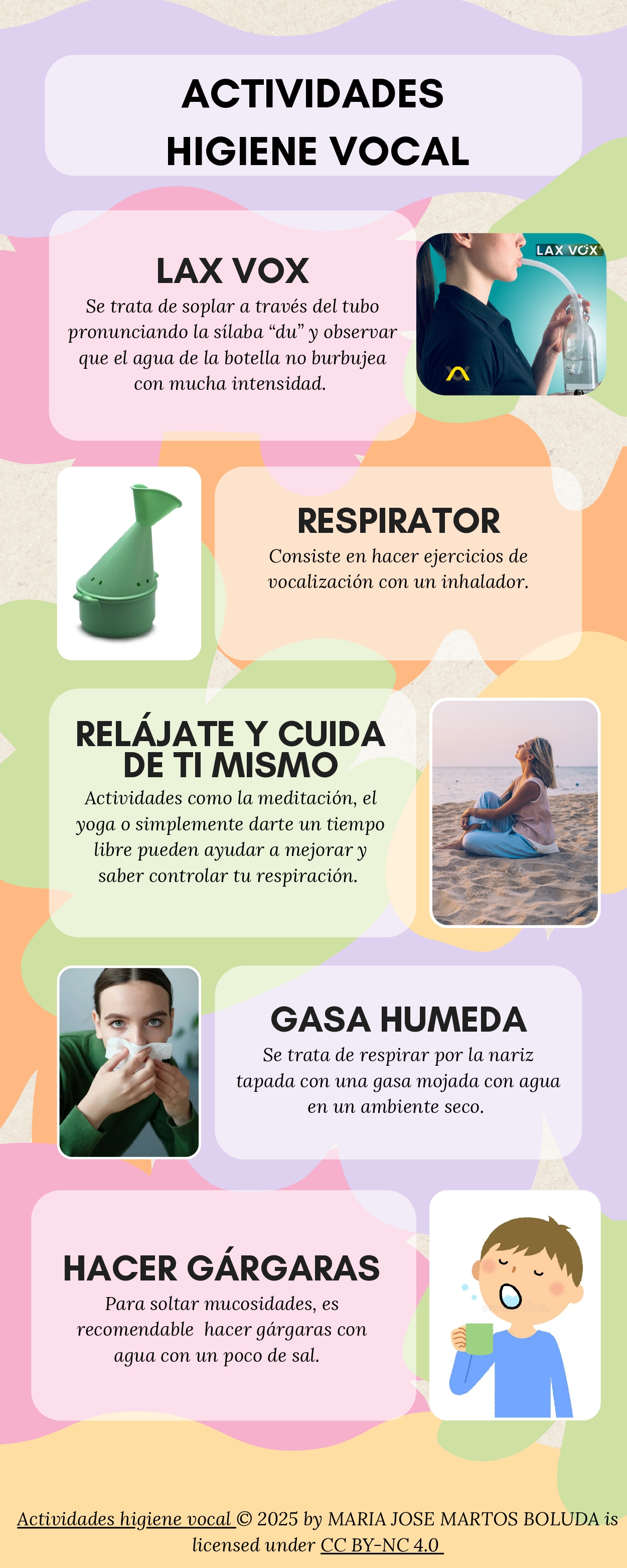 Una infografía realizada en Canva con imágenes muy sencillas para que el alumnado de primero de canto sepa como realizar las actividades propuestas por el docente.
