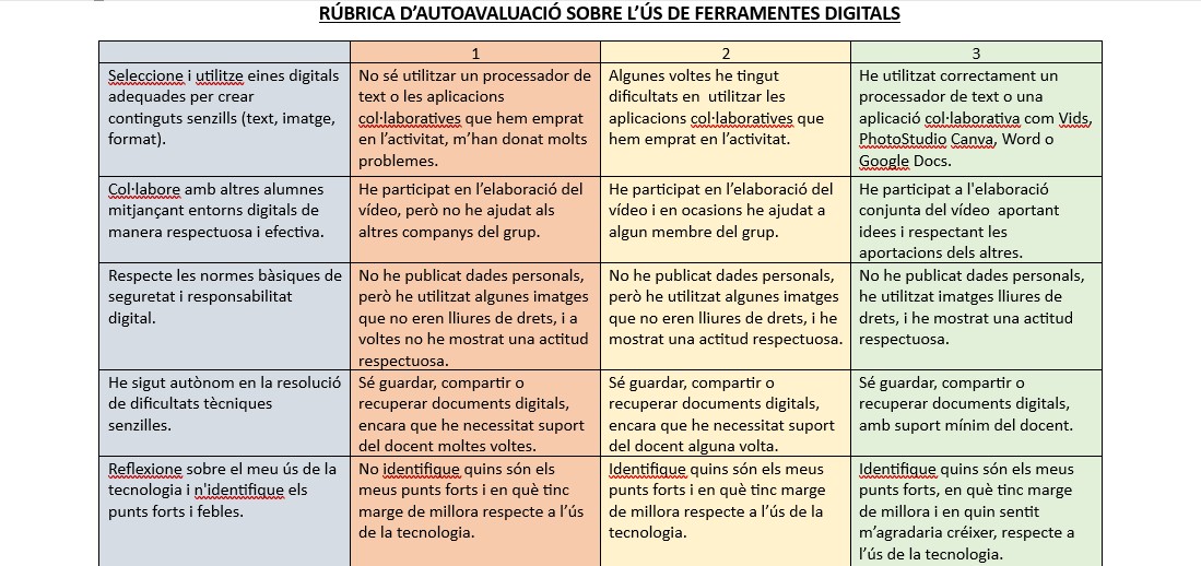 Rúbrica d'autoavaluació sobre l'ús de ferramentes digitals per a alumnes de 2º ESO (Activitat St. James Way).