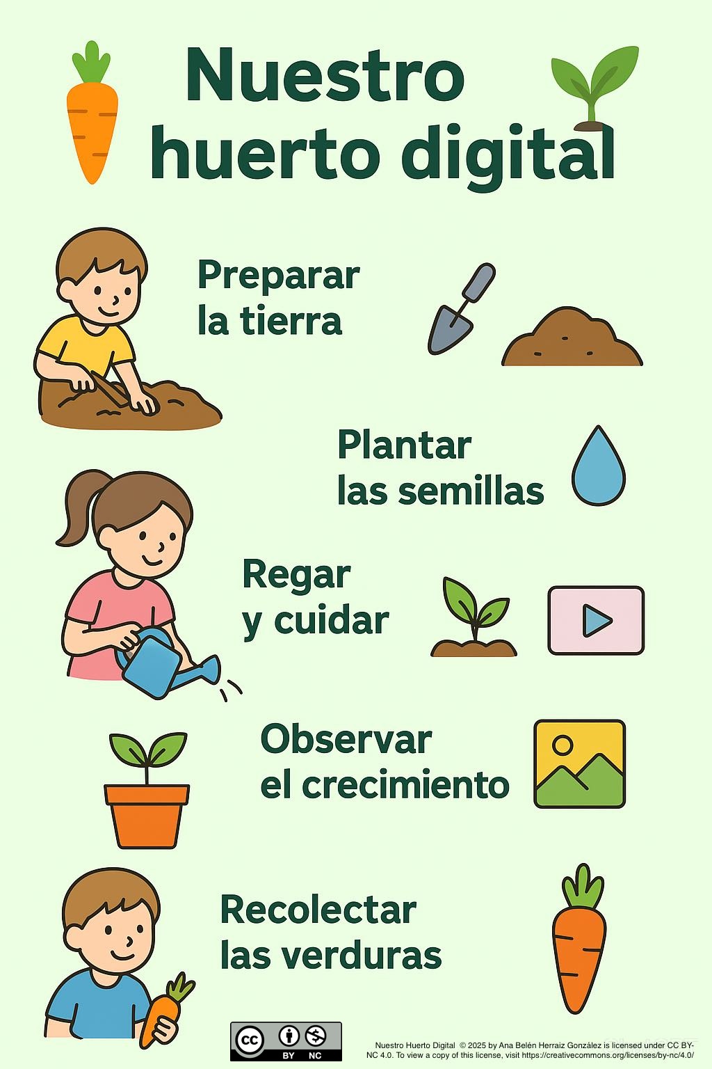Infografía interactiva (creada con Canva) sobre el proceso de sembrar y cuidar un huerto escolar. Adaptada con pictogramas de ARASAAC para favorecer la inclusión. Licencia Creative Commons BY-NC para permitir su compartición.