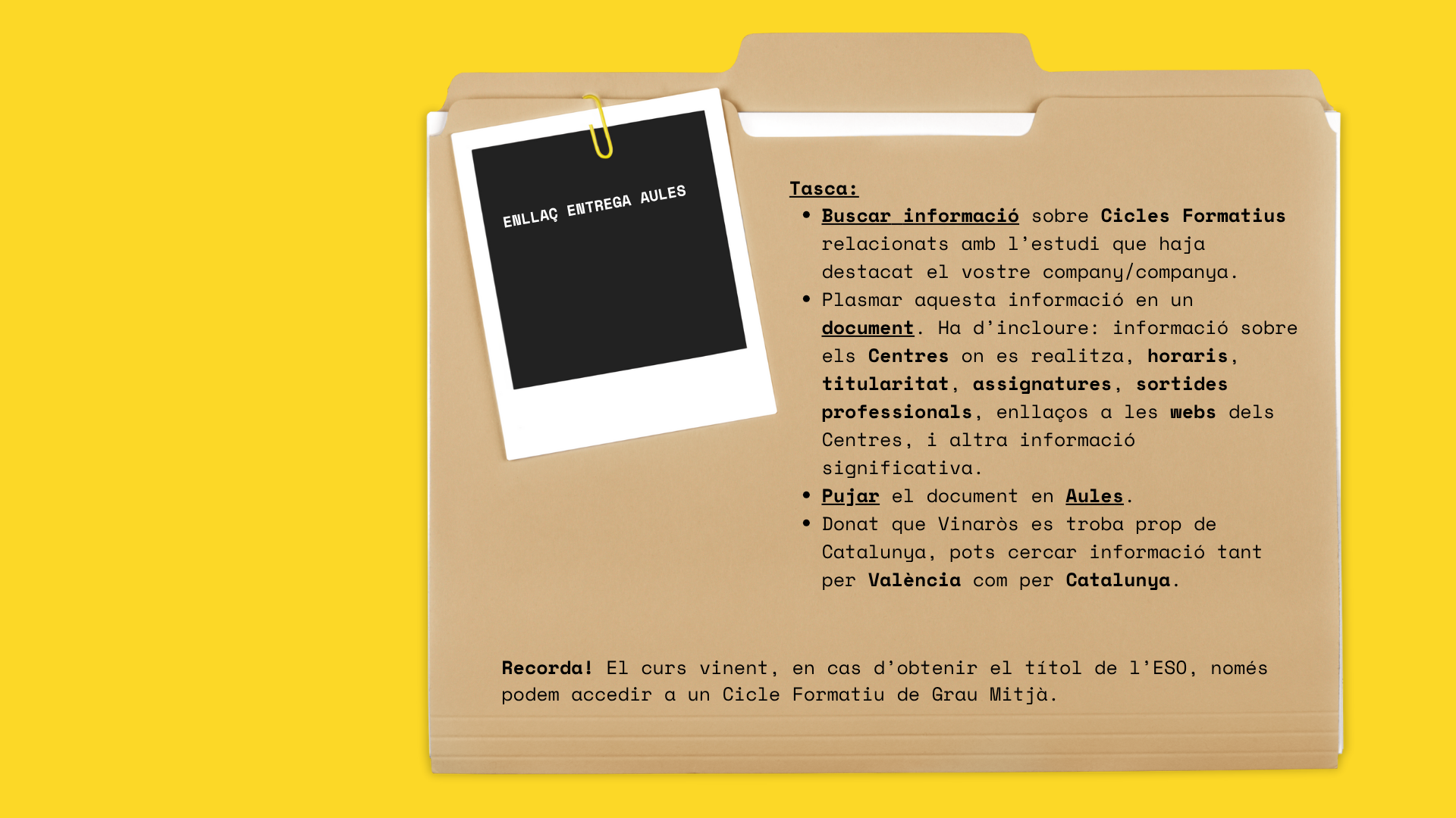 Aquest recurs s’integra dins del programa d’orientació educativa i proposa una activitat de recerca d’informació en què l’alumnat investiga les opcions acadèmiques i professionals que li agradaria seguir. Per realitzar-la, s’utilitzen recursos TIC que fomenten l’autonomia, la reflexió personal i el coneixement de les diverses possibilitats formatives i laborals.