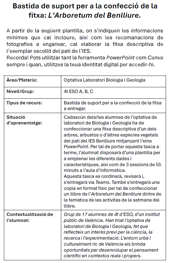 Cadascun dels/les alumnes de l’optativa de laboratori de Biologia i Geologia ha de confeccionar una fitxa descriptiva d’un dels arbres, arbustos o d’altres espècies vegetals del pati del IES Benlliure mitjançant l’eina PowerPoint. Per tal de portar aquesta tasca a terme, l’alumnat disposarà d’una plantilla per a emplenar les diferents dades i característiques, així com de 3 sessions de 55 minuts a l’aula d’informàtica. Aquesta tasca es coordinarà, revisarà i, s’entregarà via Teams. També s’entregarà una copia en format físic per tal de confeccionar un llibre de l’Arboretum del Benlliure dintre de la temàtica de les activitats de la setmana del llibre.