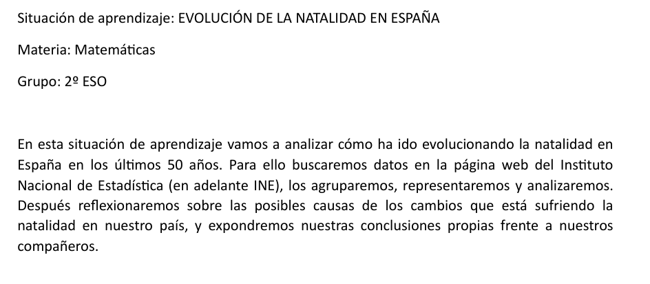 Situación de aprendizaje del área de Matemáticas recomendada para alumnos de Secundaria a partir de 2º de la ESO. En ella se utiliza la hoja de cálculo Excel para trabajar la rama de Estadística empleando los datos demográficos publicados por el Instituto Nacional de Estadística español.
