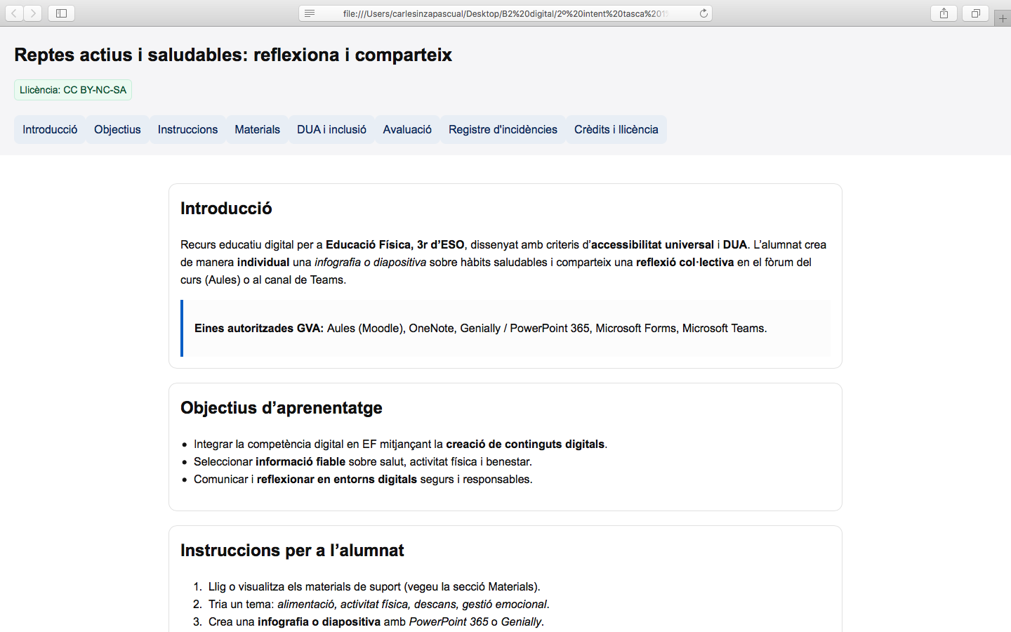 Llig o visualitza els materials de suport (vegeu la secció Materials). Tria un tema: alimentació, activitat física, descans, gestió emocional. Crea una infografia o diapositiva amb PowerPoint 365 o Genially. Publica el resultat al fòrum d’Aules o al canal de Teams. Comenta de forma constructiva el treball de dos companys/es (mínim 1 idea que t’ha agradat i 1 proposta de millora). Completa l’autoavaluació (enllaç a Forms).