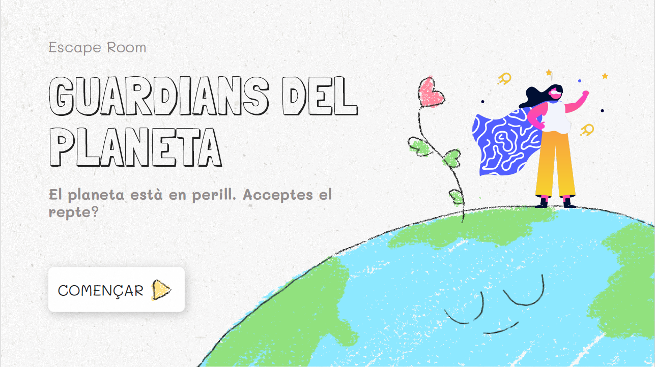 “Escape room: Guardians del planeta” es tracta d’un recurs digital interactiu dissenyat amb l’eina Genially que consta de quatre activitats amb l’objectiu de fomentar el desenvolupament de la competència digital de l’alumnat. A través d’una narrativa motivadora, l’alumnat haurà de superar diferents proves digitals relacionades amb la protecció del medi ambient.